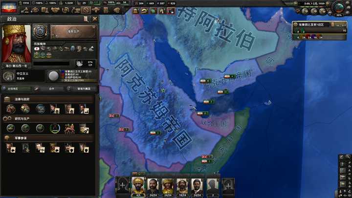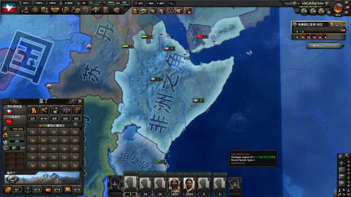 点出工业线底下“发展非洲之角”国策就会出现统一非洲之角的决议,任何一条政治线都可以成立。成立需要占据厄立特里亚和索马里兰,成立后还可以进一步扩展一些核心。