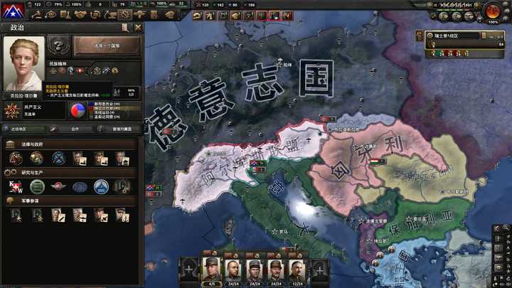 黑线、蓝线以及最左边的圣哥达同盟线都可以成立,核心范围包括整个奥地利,大半个北意大利和法国东南部一小部分。圣哥达同盟线非常值得一提,不仅可以很轻松地让奥地利、意大利、法国心甘情愿地将地拱手相送(提高关系,在边境堆兵应该也能提高成功率),而且点出“阿尔卑斯保护国”国策后会让你当前的联邦主席成为终身总统,可以永久保留TA的buff,并按照其意识形态变身任何一种政体。