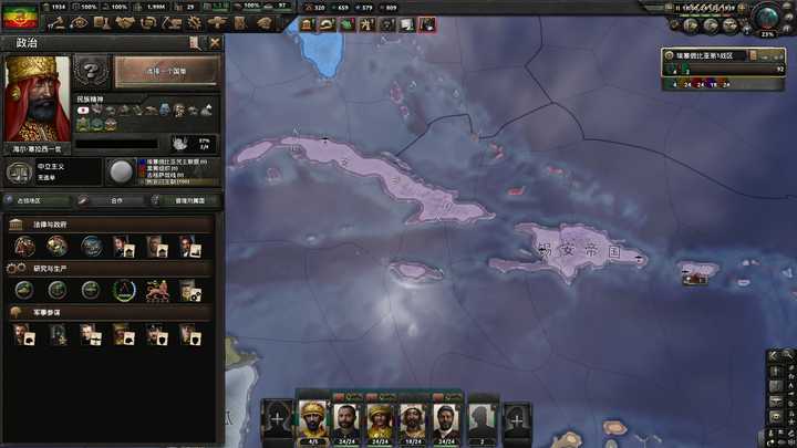 埃塞皇帝线的最终分支之一,完成“耶和华”国策后出现决议,并弹出事件索要加勒比海一些岛屿的控制权。能获得加勒比海岛屿以及佛罗里达沿岸的核心。