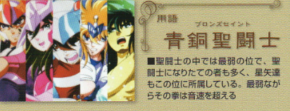 圣斗士中最低级别的战士,战斗力远远凌驾于一般人类之上,一般配合白银圣斗士行动,他们的拳速及身体的动作都到达到了音速,挥拳划破天空,踏脚粉碎大地,身穿青铜圣衣。