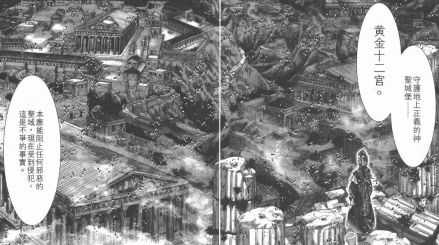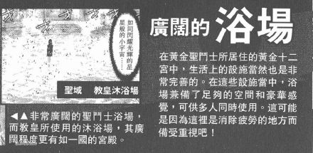 在黄金圣斗士居住的黄金十二宫中,生活的设施也是非常完善的,在这些设施中浴场兼备了足够的空间和豪华感觉,可供多人同时使用。这可能是因为这里是消除疲劳的地方而备受重视吧。而教皇所使用的沐浴场其广阔程度有如一国的宫殿。
