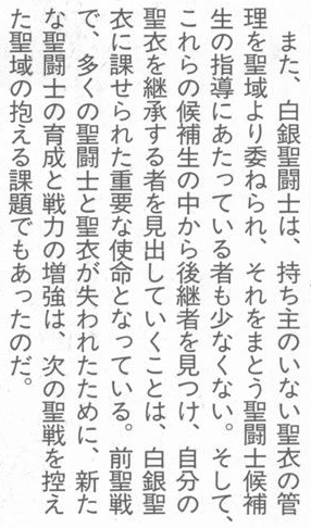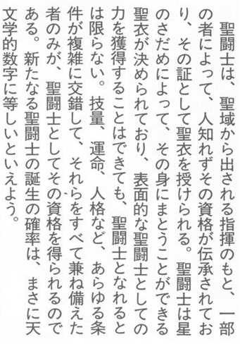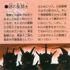 众所周知圣斗士共有八十八名,不过各级层分别有几人却不太清楚。以黄道十二宫为守护星座的黄金圣斗士是十二名,白银是其数倍增的二十四名,青铜是四十八名。但这些数字相加也只有八十四名。另外四名圣斗士在圣域也属于机密,他们的存在尚未被判明。也许当与天界诸神的战争打响之时,他们的秘密会被揭晓。