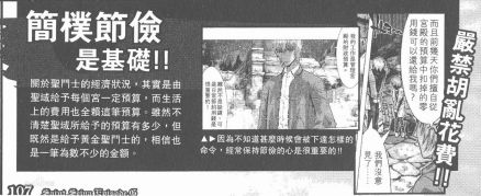 的经济状况,其实是由圣域给予每个宫一定预算,而生活上的费用也全赖这笔预算。虽然不清楚圣域所给予的预算有多少,但既然是给予黄金圣斗士的,相信也是一笔为数不少的金额。因为不知道什么时候会被下达怎样的命令,经常保持节俭的心是很重要的!!一个宫里除了侍从,还有管家。管家负责的工作是管理宫殿的财政预算,并可以随便决定黄金圣斗士们的零用钱。