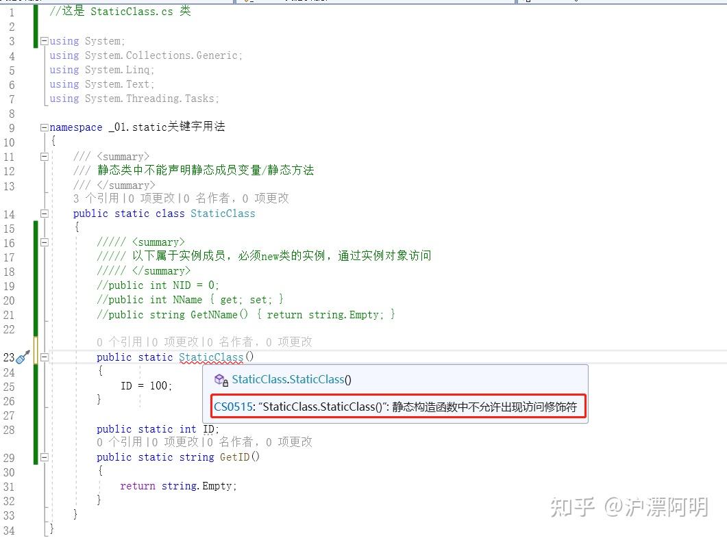 1.5)静态类只能包含静态构造函数, 声明时前面不能带访问修饰符 ,声明示例:static className(){}。