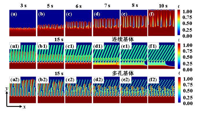 图3 隔膜孔结构诱导的各向异性Li+扩散对锂枝晶生长的影响:(a-f)无隔膜的情形,(a1-f1)隔膜由连续基体组成的情形,(a2-f2)隔膜由多孔基体组成的情形。