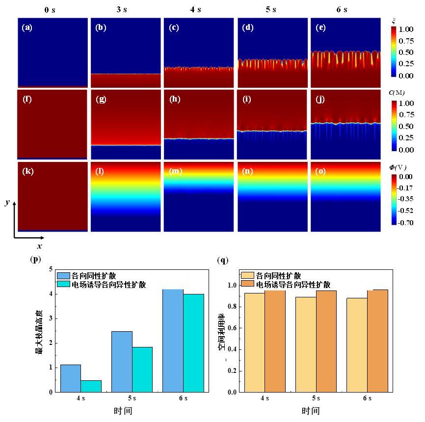 图2 电场依赖的各向异性Li+扩散对锂枝晶形貌(a-e),锂离子浓度分布(f-j)及电势分布(k-o)的影响, (p) 4 s,5 s,6 s时的最大枝晶高度对比,(q) 4 s,5 s,6 s时的空间利用率对比。