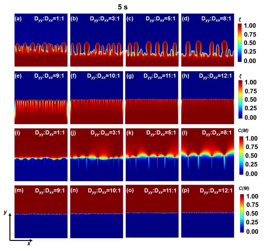图1 电解液固有的各向异性Li+扩散强度( Dyy : Dxx )对锂枝晶形貌(a-h)及锂离子浓度分布(i-p)的影响