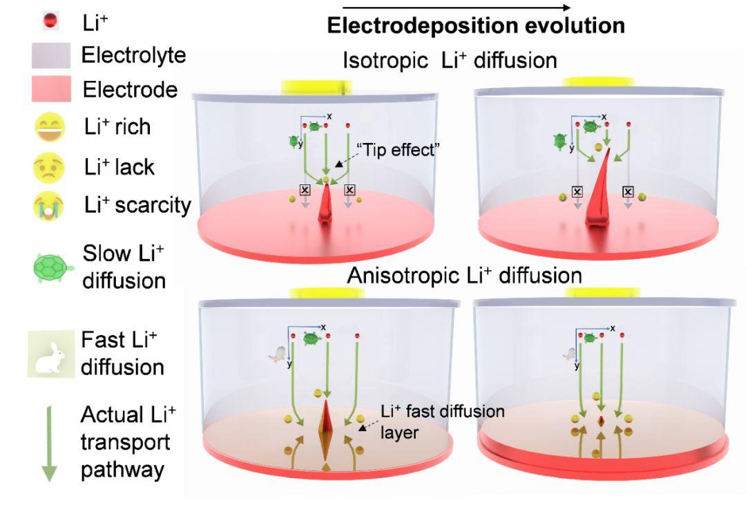 1. 电解液固有的各向异性Li+扩散对锂枝晶生长的影响