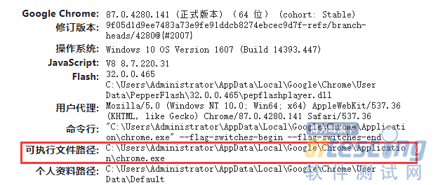 1.将chrome浏览器安装地址配置到环境变量Path中。如果不知道chrome的地址安装在哪里,在浏览器中输入:chrome://version/进行查看
