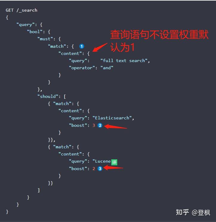 想要查询关于 “full-text search(全文搜索)” 的文档,但我们希望为提及 “Elasticsearch” 或 “Lucene” 的文档给予更高的