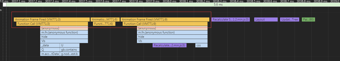 希望的效果是在一帧一帧地执行,然而浏览器会将多个操作合并到同一帧中,检测发现