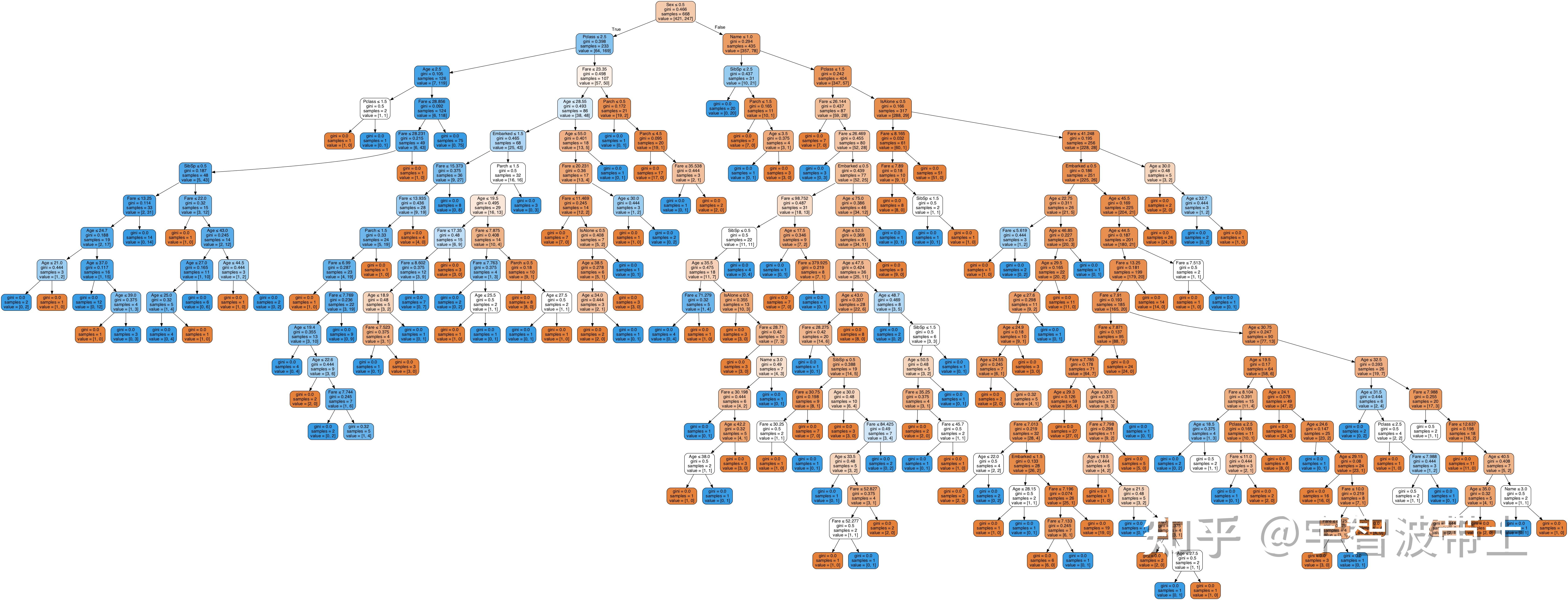 从程序的输出结果中可以发现:建立的模型在训练数据集上的精度为0.99,而在验证集上的精度就只有0.72,这是很明显的模型过拟合信号。为了更直观的展示过拟合决策树的情况,可以将其结果可视化分析,使用下面的程序获得如图1所示的过拟合决策时的结构图。