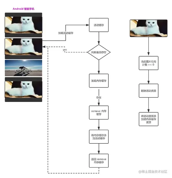 中删除并添加到活动缓存中 3.下次加载就可以直接加载活动缓存了 4.当图片引用为0时,会从活动缓存中清除并添加到