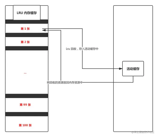 的时候,如果刚刚滑动到 100 张,那么就会回收掉我们已经加载出来的第一张,这个时候如果返回滑动到第一张,会重新判断是否有内存缓存,如果没有就会重新开一个