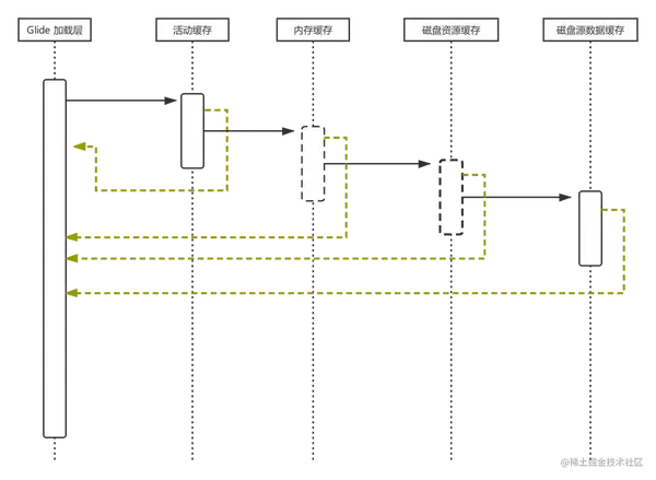 内存缓存加载的流程 1.首先去获取活动缓存,如果加载到则直接返回,没有则进入下一步 2.接着去获取
