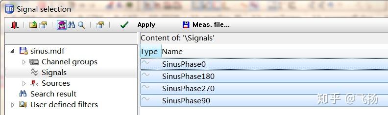 正文: 如果需要将mdf/mf4格式数据保存为mat格式,我们需要知道mdf/mf4格式文件的数据结构是什么样的?MATLAB 2016B中针对mdf/mf4格式文件有一个专门的函数可用于打开此文件,函数名为“mdf( )”。本文以CANape软件示例的一个mdf文件为例,首先用CANape打开一个mdf文件,查看文件有哪些信号?示例文件在CANape安装目录下,如本机为:D:\Program Files (x86)\Vector\Examples\Example\sinus.mdf。