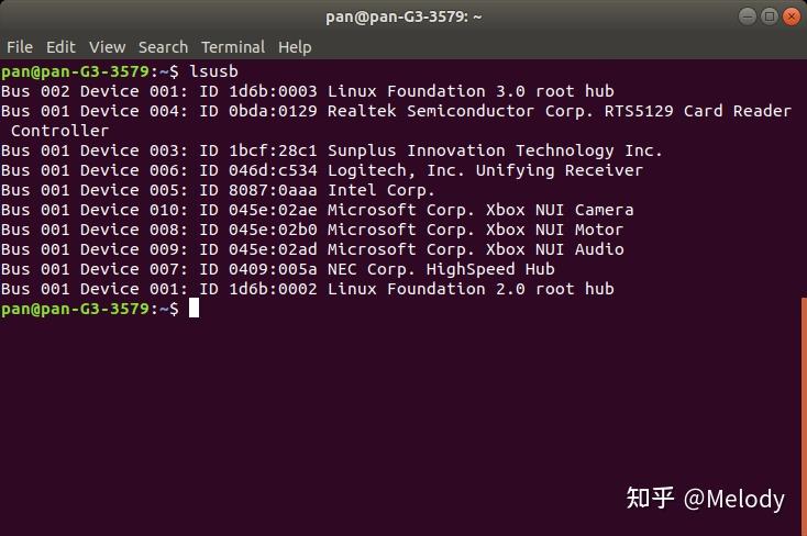 将Kinect连接到PC端的USB接口,然后使用lsusb命令查看是否连接成功,如下图所示,在打印的信息中可以找到Kinect相关信息。