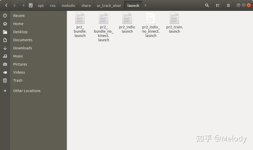 安装完成后,在ROS默认安装路径下(/opt/ros/melodic/share)找到它。打开该功能包的launch文件夹,可以看到很多个launch文件。这些都是针对PR2机器人使用的二维码识别例程,我们可以在其基础上修改。