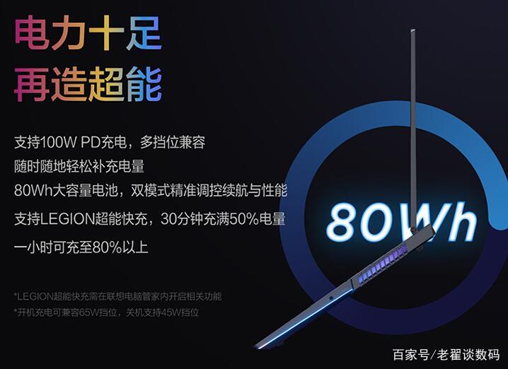 2、续航方面:其内置了一块80wh大容量的电池,支持100w的pd快充功能,30分钟即可以充满50%的电量,1小时可以充满80%以上电量。续航能力和充电能力都比较强。