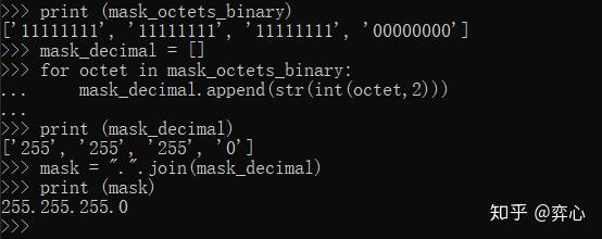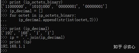 知道如何在Python里将十进制的IP地址和子网掩码转换成二进制后,我们再来看下如何将二进制的IP地址和子网掩码转换回十进制(代码接续前文):