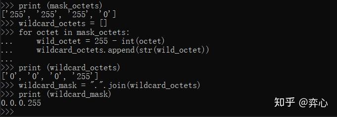 最后我们来谈谈反掩码,所谓反掩码就是将子网掩码的二进制里的1换成0,将0换成1,比如255.255.255.0的二进制为11111111.11111111.11111111.00000000,它的反掩码即为00000000.00000000.00000000.11111111,也就是0.0.0.255。在Python里我们可以这样表示(代码接上文):