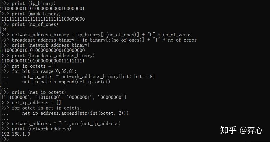 - 在使用上面提到的填充0的方法得到了网络IP的二进制地址(11000000101010000000000100000000)后,为了将它转换成四个八位组的十进制形式,这里我们巧用for循环配合range(0,32,8)来将该网络IP的二进制地址切成四段,每段含8个二进制数字,作为元素被依次添加进net_ip_octets这个空列表,最后使用带参数2的int()函数将它们转换成十进制,然后再将这四个十进制数字作为元素依次添加进net_ip_address这个空列表,最后配合".".join()将给列表转化为字符串,即得到了网络IP:192.168.1.0