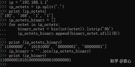 - 这里我们用字符串自带的split()函数将ip地址(字符串‘192.168.1.1')转换成列表ip_octets,然后创建一个空列表ip_octets_binary,随后用for循环遍历ip_octets里的元素,将它们每个用bin()函数转换成二进制形式,然后一一写入刚才创建的空列表ip_octets_binary里面。
