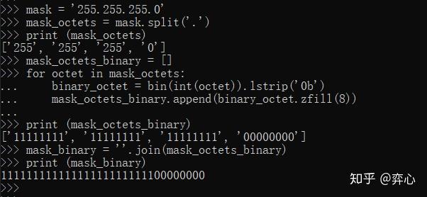 同样的代码也适用于子网掩码,比如在Python中要将255.255.255.0这个掩码转换成二进制形式,代码可以这么写: