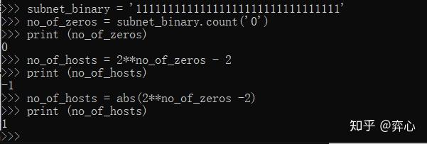 no_of_hosts = abs(2 ** no_of_zeros - 2) #当掩码为/32时,2的0次方减1等于-1,需要用abs()函数将其转换成正数1.