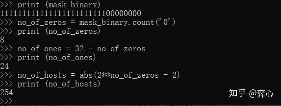我们知道要算出一个网段内有多少可用的IP地址需要知道该网段的子网掩码以二进制表达时里面有多少个0 (number of zeros,在Python中我们将其赋值给变量no_of_zeros),然后套用公式2 ** no_of_zeros - 2即可算出,比如这里给定的子网掩码255.255.255.0,将其转化为二进制为1111111.1111111.11111111.00000000,总共8个0, 那么2**8-2 = 254,即为我们要的结果,这个运算过程在Python中的计算方式如下(代码接前文):