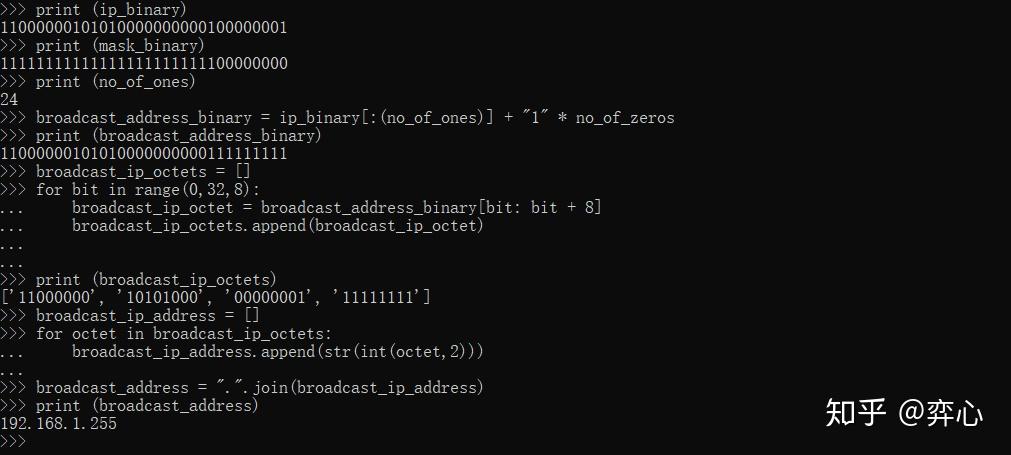 我们知道网络IP和广播IP是两个很重要的概念,在给定一个IP地址及其子网掩码后,计算该网段的网络IP和广播IP的方法想必大家都知道,即将IP地址和子网掩码分别转换成二进制,然后将两者对比,看子网掩码的二进制有多少个1,那么IP地址的二进制就从左至右保留多少位,剩下的部分全部以0填充,即可得到网络IP的二进制地址,如果剩下部分全部以1填充,则得到广播IP的二进制地址(这里就不画图演示了,这些都是网工最最最基础的知识点,不懂的回去把CCENT或CCNA的书重新翻出来读)。下面我们在Python中演示如何实现找出一个指定IP所在网段的网络IP和广播IP(代码接前文,以前文给定的IP地址192.168.1.1和子网掩码255.255.255.0为例):