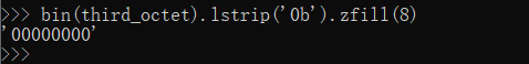 - 关于binary_octet = bin(int(octet)).lstrip('0b'),bin()只能将数据类型为整数的十进制数转换成二进制,因此这里我们要先将字符串用int()转换成整数后再来调用bin()函数,而bin()函数本身会在转化后的二进制数字前面加上'0b',我们必须调用lstrip('0b')将其拿掉,演示如下: