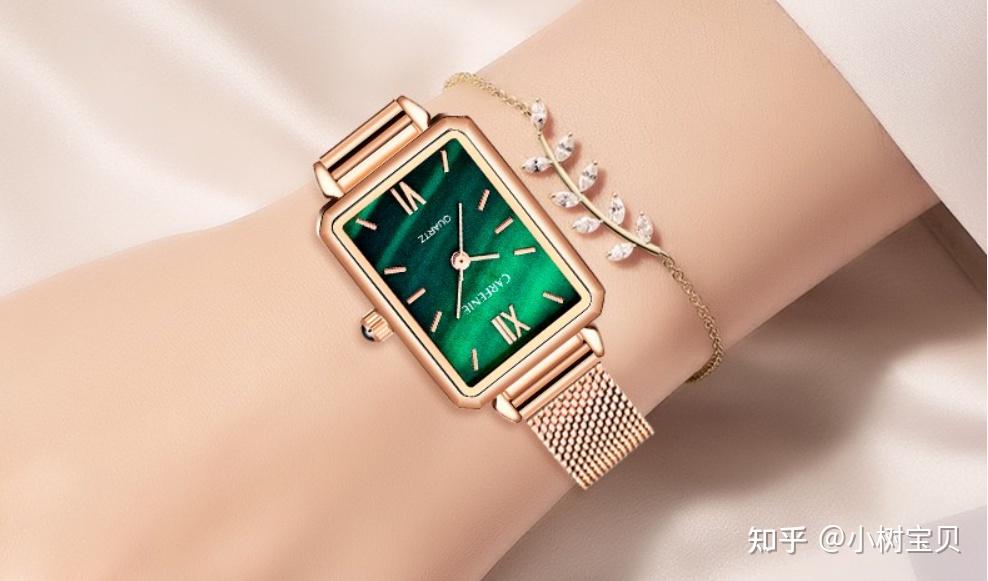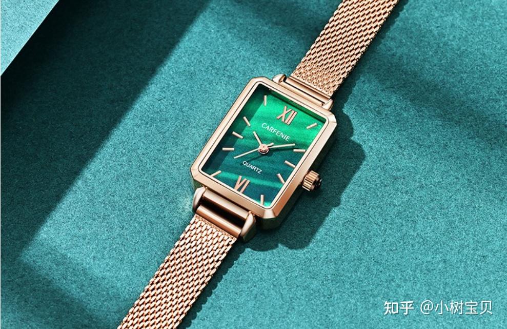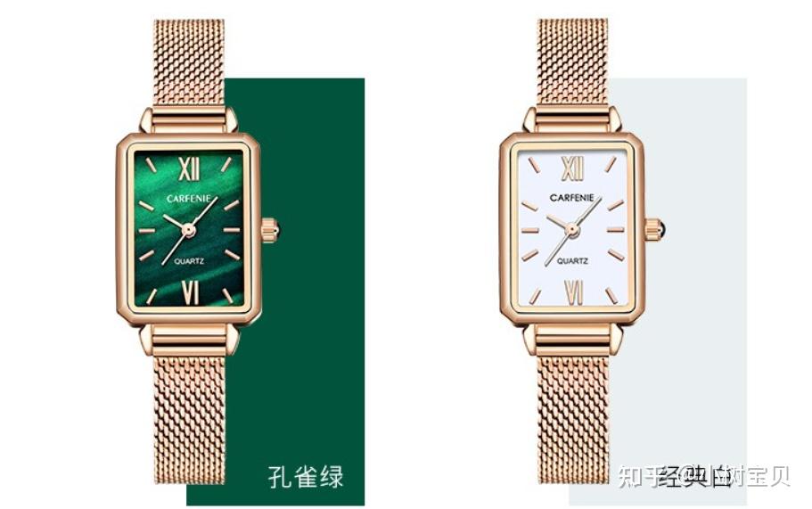卡芬妮(CARFENIE)这款腕表特别清新甜美,玫瑰金搭配孔雀绿/白色表盘,或是皮表带搭配红色、黑色表盘,戴在手上很显知性优雅,全身防水设计佩戴更加方便, 最具特色的这块孔雀绿盘,就像一道闪亮绿光,象征着美丽与幸福。