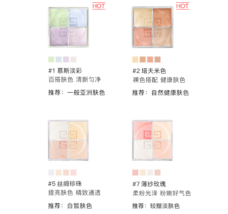 散粉中的明星产品,纪梵希四宫格四色散粉,简直不要太好用了,无限回购的一款散粉。粉质细腻服帖,自然清淡的香味,四色调和,适合任何肤质,真对不同肤色有不同色号可选,最经典的就是这个1号慕斯淡彩,清新自然,控油定妆,打造自然妆容一整天!