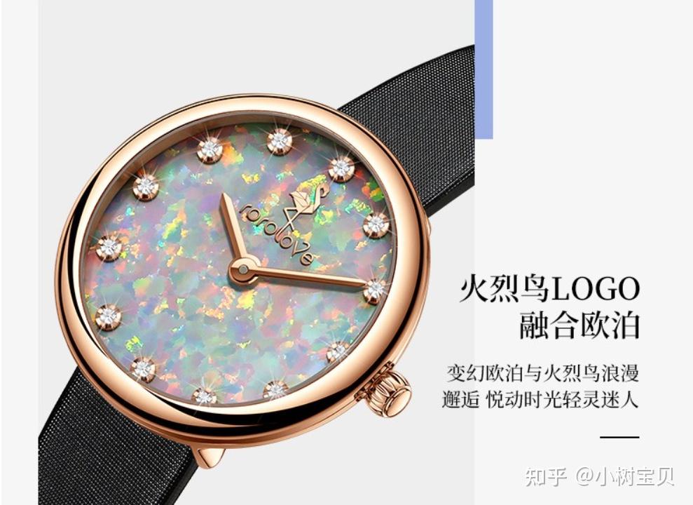 很精致的一款女士腕表,采用欧泊宝石表盘,每块表盘都是不规则纹理,镶嵌12颗天然钻石,它的清澈多彩寓意着纯洁的爱情,也被比喻为丘比特石,是一款蕴藏爱意于分秒之中的珍贵礼物~!总共有8种不同颜色及两款表盘尺寸可选,满足不同颜色喜好及胖瘦不同的女生佩戴!