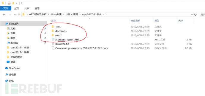 从 GitHub 上下载关于 CVE-2017-11826 漏洞的文件夹,解压后发现包括解压过的 docx 文件、README 文件、俄文文档,俄文文档没有仔细看,好像是关于漏洞利用的。