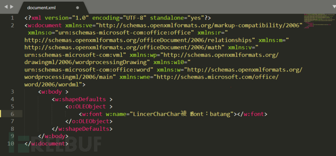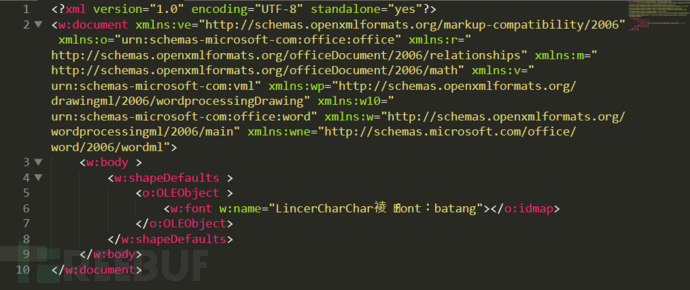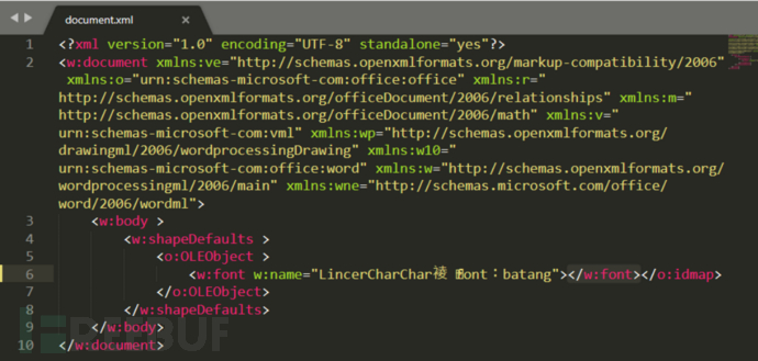包含漏洞的 XML 文件为 document.xml,文件在 `word` 路径下。打开 document.xml 文件,分析后发现 <w:font> 标签使用了 </o:idmap> 标签进行闭合,而 <w:font> 标签的 w:name 属性有点奇怪,可能是用于控制某一个地址的值。