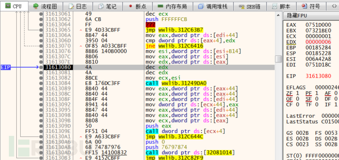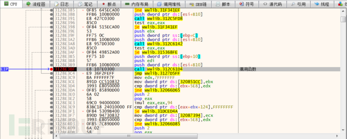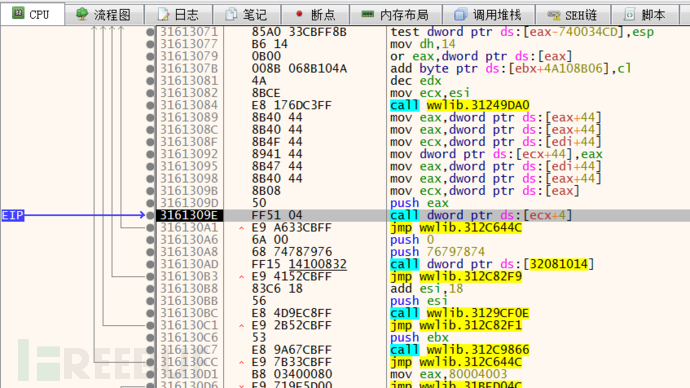 调试到 0x31613084 地址时发现会调用 wwlib.31249DA0 函数,经过分析后发现该函数的返回值和异常处的虚函数表调用有关,所以进入这个函数看看。