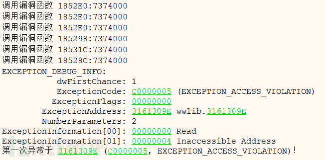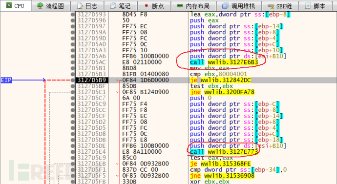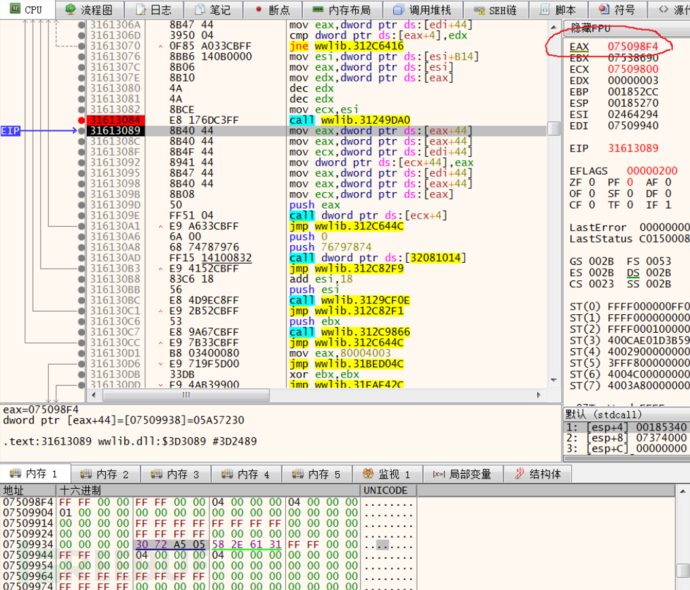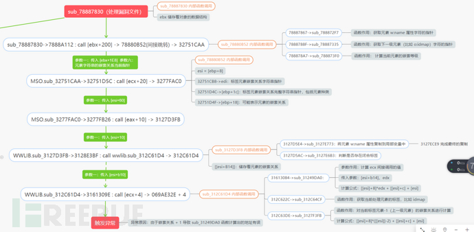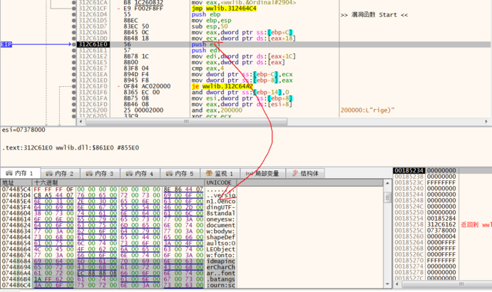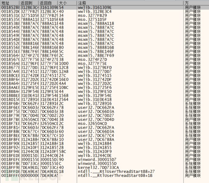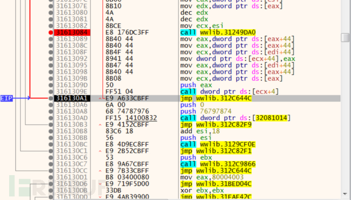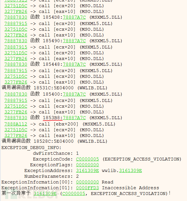 查看堆栈调用,发现用于处理 XML 格式的 msxml 模块,msxml 模块通过间接调用 wwlib 模块去协助解析 XML 格式。暂且将 wwlib.3161309E 函数定为漏洞函数。
