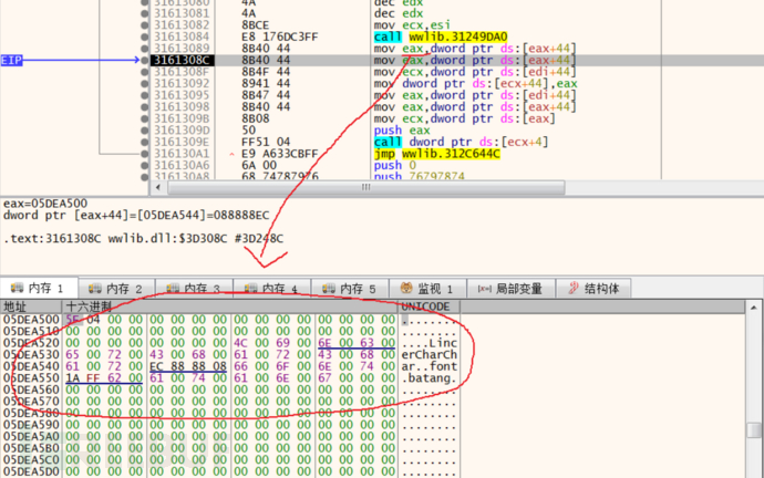 调用完 wwlib.31249DA0 后会将[[0x0751D140+44]+44]地址的值作为虚函数表指针进行虚函数调用,进而触发异常。如图所示可以看出[0x0751D140+44]地址被覆盖成了 <w:font> 元素的 w:name 属性,所以攻击者通过修改 <w:font> 标签的 w:name 属性就可以做到调用任意地址。