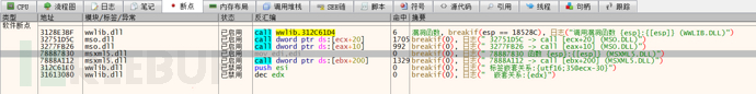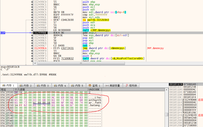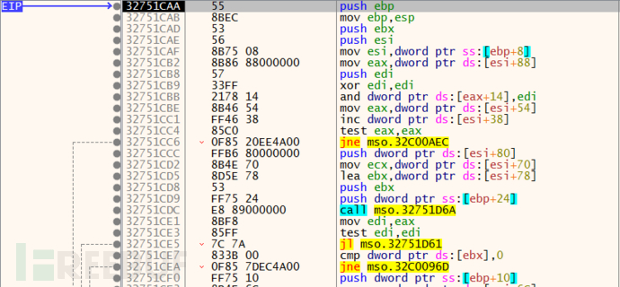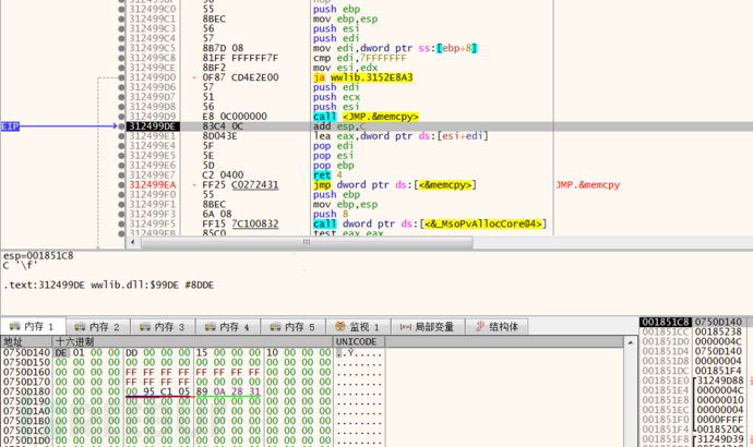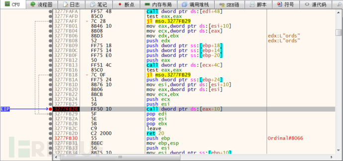调用的函数为 mso.32751CAA,其实 MSO 模块的函数调用没有太大的作用,只是给后面 wwlib 模块的做间接处理。