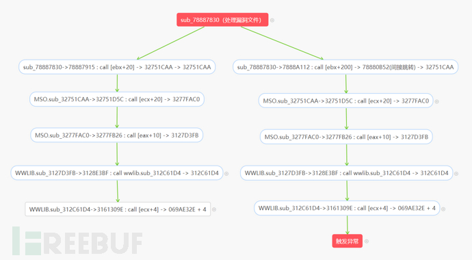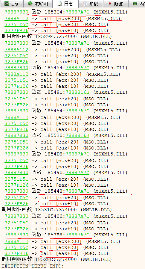 从日志中可以发现漏洞函数的调用都是通过 sub_78887830 函数中的 call [ebx+200] 的指令实现的,但是倒数第二个漏洞函数的调用却没有经过 call [ebx+200] 而是直接跳到了 MSO 模块。