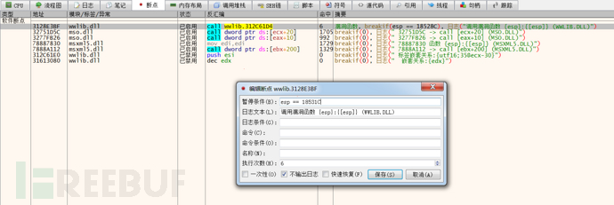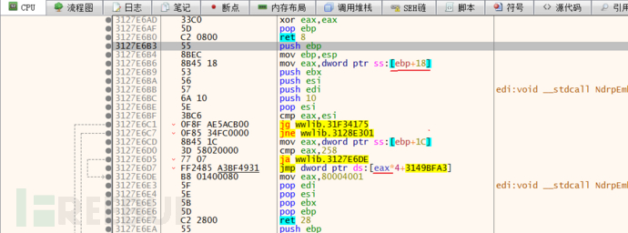 需要注意的是再上面的分析中该跳转并没有实现,也就是说这里在复制完 w:name 属性之后直接返回了。而判断跳转的值是由 wwlib.3127E6B3 返回的,进入该函数,分析后发现在函数末尾处会将 0x80004001 赋值给 eax,在这之前会以 0x3149BFA3 作为基址,以 eax * 4 做为偏移地址进行调用,而 eax 是通过 [ebp-1c] 传进来的,对该位置下记录断点后查看日志。