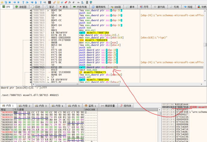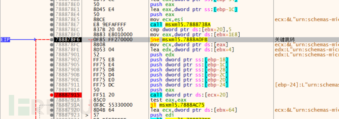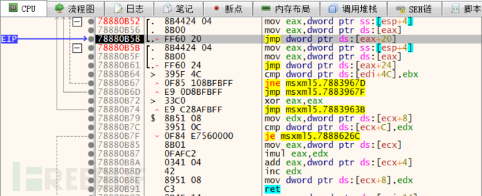 对倒数第二个漏洞函数下断点。断下后分析堆栈调用,发现 msxml.78887830 函数中的 call [ecx+20] 的指令也会调用漏洞函数。