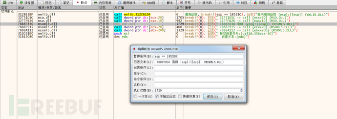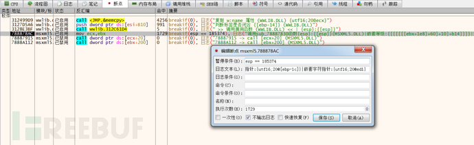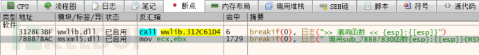 为了快速了解 msxml 模块的处理流程,对调用堆栈中的所有 msxml 模块函数下记录断点,查看日志。