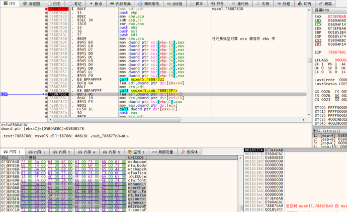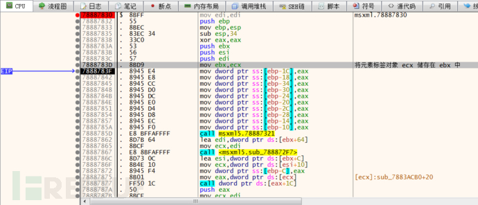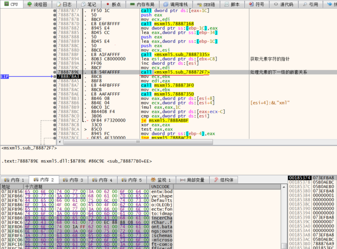 在 msxml.78887830 函数开头会将元素标签对象储存在 ebx 中,元素标签对象储存当前解析元素的信息,主要是元素的嵌套关系,嵌套等级等。