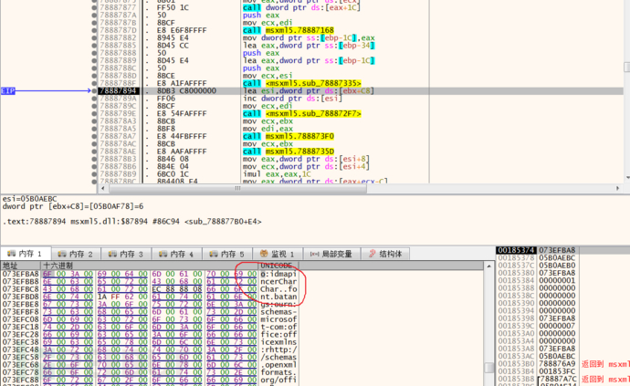 获取完 o:idmap 元素字符的指针后,调用 msxml.788872F7 函数解析 o:idmap 元素,在内存窗口可以看出字符指针已经指向了 incer 的位置,说明已经把 idmap 标签解析出来了。