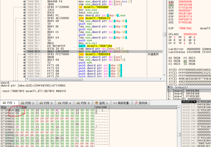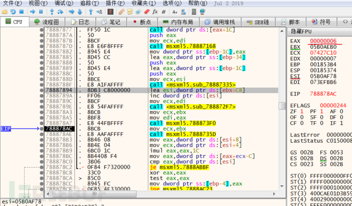 但是在异常处嵌套关系为 6,对最后一次调用 msxml.78887830 函数下断点,查看嵌套关系是何时变为 6 的。