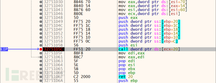到达 0x32751D5C 的位置后执行 call [ecx+20] 指令调用 sub_3277FAC0 函数,此时 esi = [esi+60]。