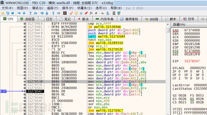 附加完成之后打开含有漏洞的文档,运行后触发异常,其中 call [ecx+4] 指令是利用虚函数表调用虚函数,而 ecx 为虚函数表指针,通过 wwlib.41249DA0 函数返回。